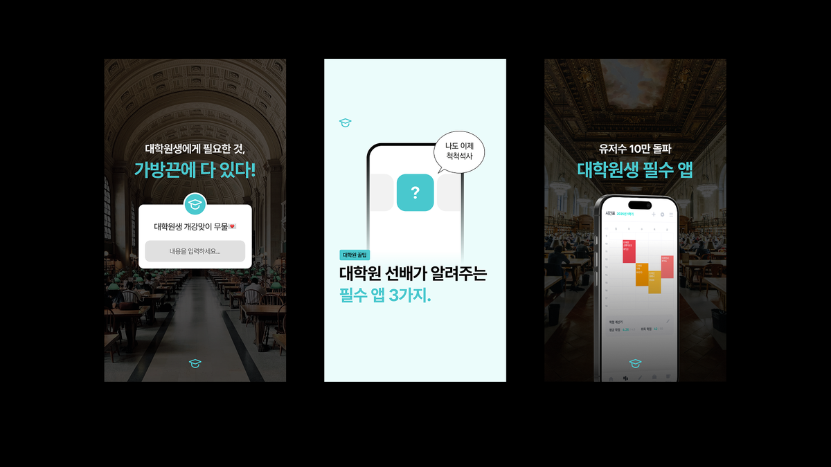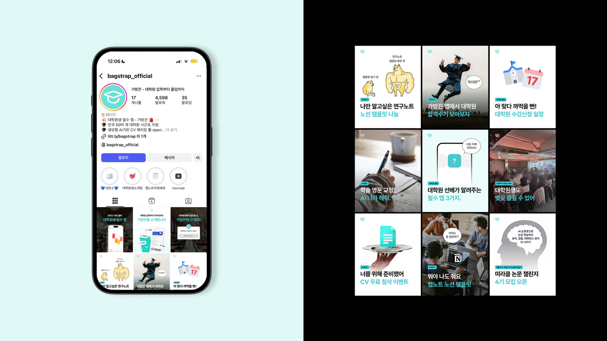 국내 최대 대학원생 커뮤니티, 가방끈의 브랜딩 프로젝트입니다. ‘연구자와 대학원생을 위한 지식 네트워크’라는 철학을 중심으로, 브랜드 스토리와 캐릭터, SNS 템플릿을 개발하여 커뮤니티의 정체성을 시각적으로 강화하고 사용자 경험을 확장했습니다.