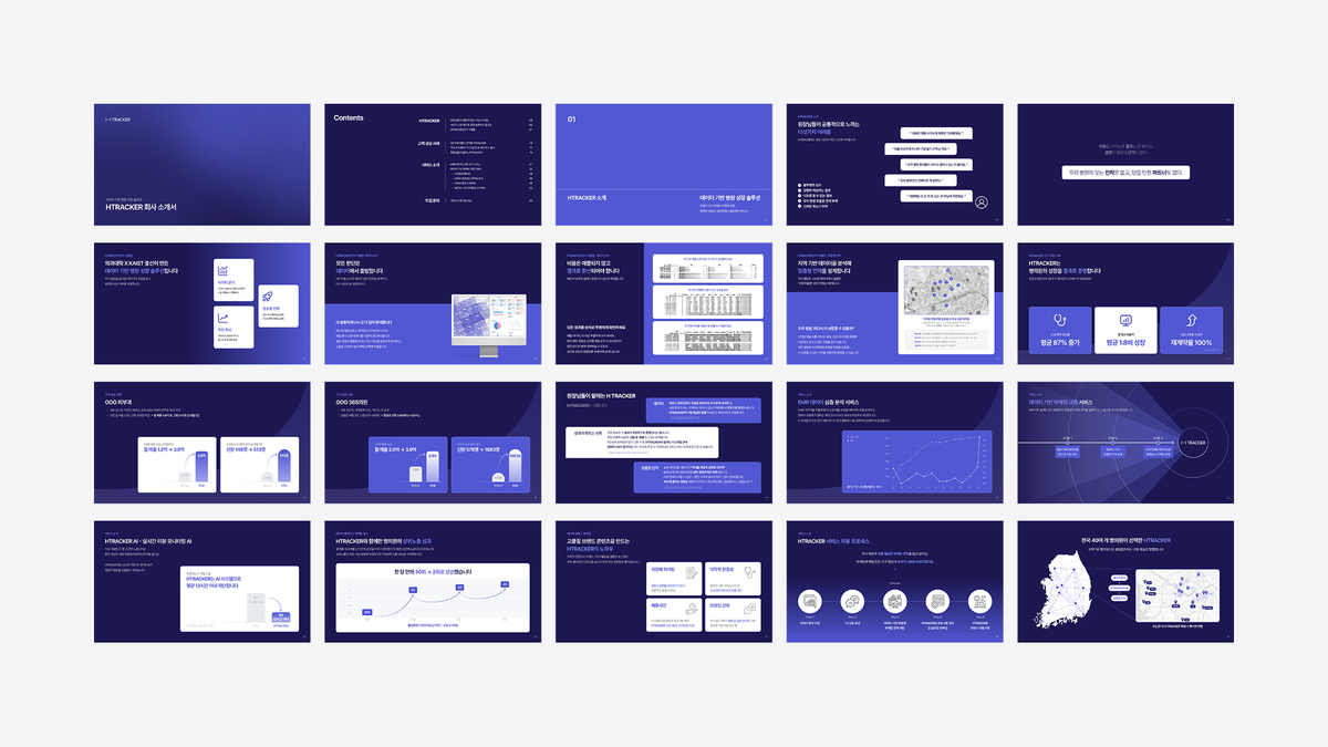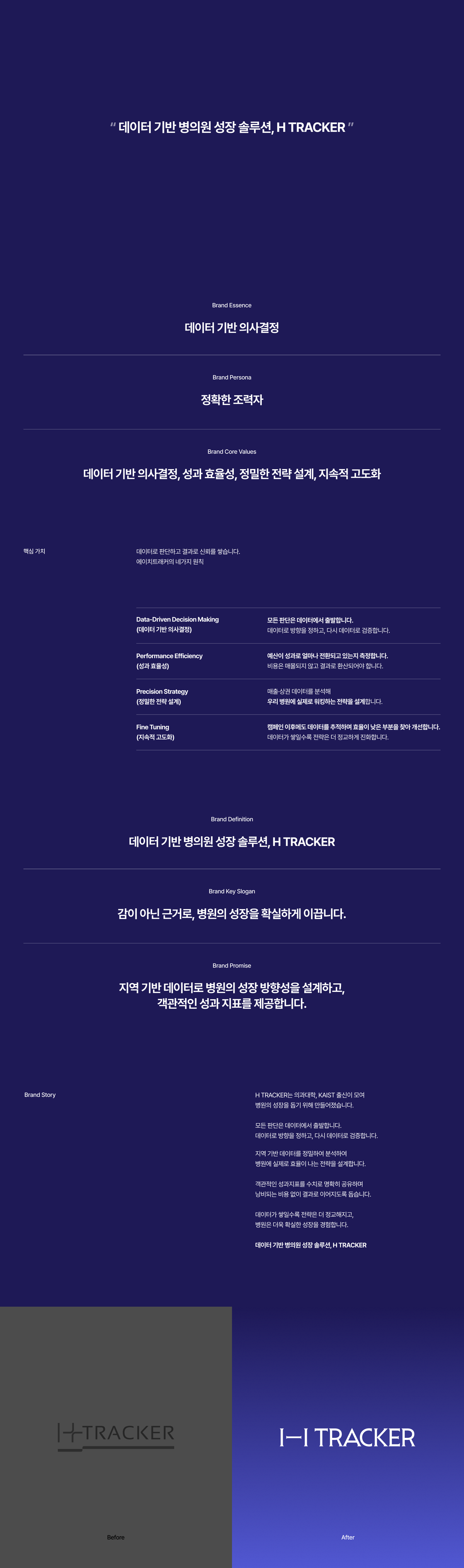 데이터 기반 병의원 성장 솔루션 브랜드 에이치트래커(HTRACKER) 통합 리브랜딩 프로젝트입니다. ‘병원의 성장은 근거 기반 의사결정에서 시작된다’는 콘셉트를 재정의하고, 데이터 중심 사고방식을 기반으로 브랜드 언어와 아이덴티티를 재구성했습니다. 데이터 구조화 원리를 중심으로 시그니처 톤을 정립하고 리포트·대시보드 중심의 비주얼 시스템을 확장했으며, 근거 중심의 버벌 브랜딩과 커뮤니케이션 템플릿을 구축해 신뢰를 기반으로 한 브랜드 경험을 설계했습니다.