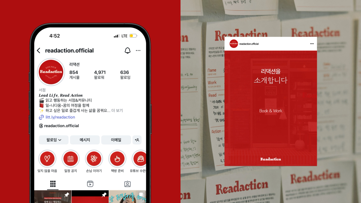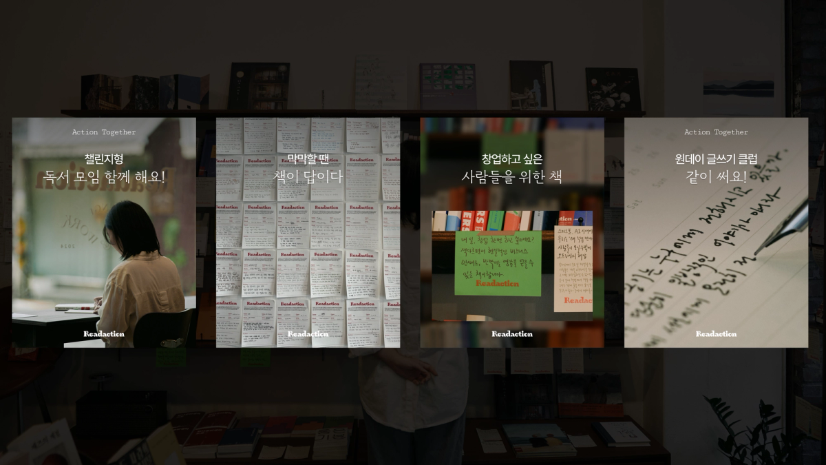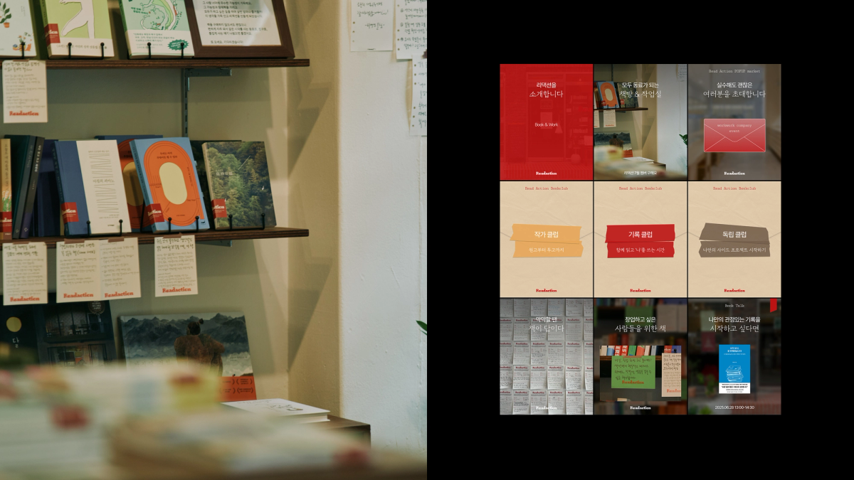 연남동의 독립서점이자 커뮤니티 공간, 리댁션의 SNS 비주얼 브랜딩 프로젝트입니다. ‘읽고 행동하는 서점’이라는 철학을 토대로, 브랜드의 메시지를 감각적이고 일관된 카드뉴스와 톤앤매너로 구현해 커뮤니티와의 연결을 확장하는 시각 언어를 구축했습니다.