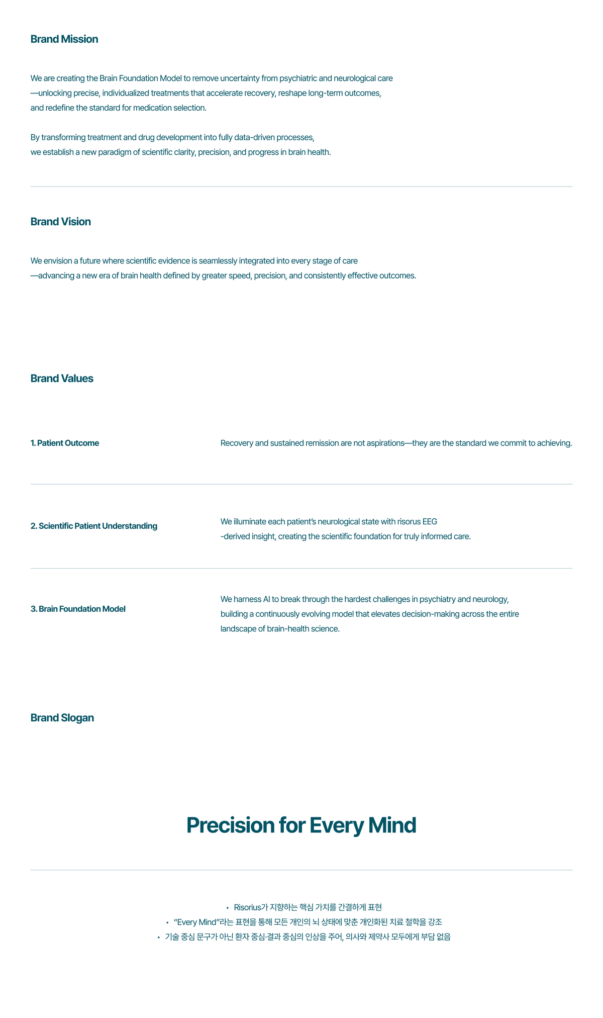 정신과·신경과 영역의 의료 불확실성을 줄이는 AI 솔루션 브랜드 리소리우스의 브랜드 정체성 구축 프로젝트입니다. ‘의학의 미래는 뇌 신호(Brain Signal)의 정확한 해석에서 시작된다’는 인식 아래, ‘정확한 근거의 축적이 더 나은 결정을 만든다’는 상위 철학을 중심으로 브랜드 언어와 비주얼 시스템을 재정의했습니다. 슬로건·브랜드 스토리·로고부터 비전·테크 이미지까지 일관된 신뢰의 톤을 구축하며, 의료 AI 스타트업으로서의 정체성과 메시지를 강화했습니다.